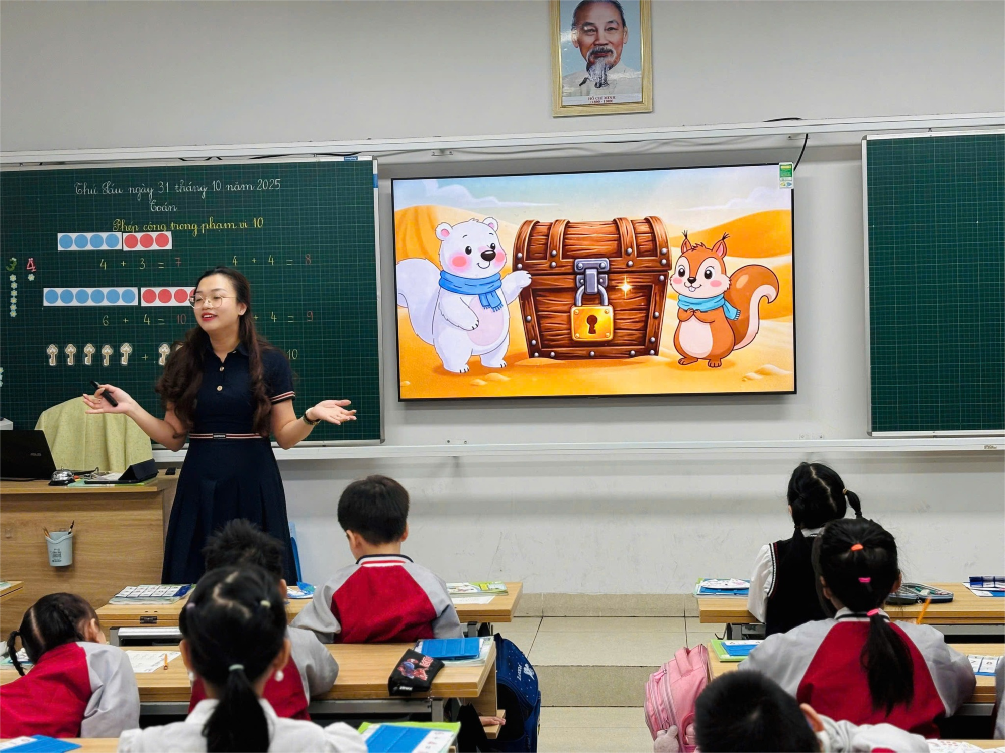 Lớp 1C – Cô giáo Mỹ Linh dẫn dắt các con bước vào tiết Toán thật sôi nổi và hấp dẫn. Với nhiều hình thức học tập phong phú – từ trò chơi, hoạt động nhóm đến khám phá trực quan – các con biết hợp tác, cùng nhau tìm kết quả, vượt qua hành trình tìm kiếm kho báu để chinh phục " Phép cộng trong phạm vi 10". Tiếng cười, tiếng vỗ tay và ánh mắt vui mừng của những “bạn nhỏ yêu Toán” khiến cả lớp rộn ràng