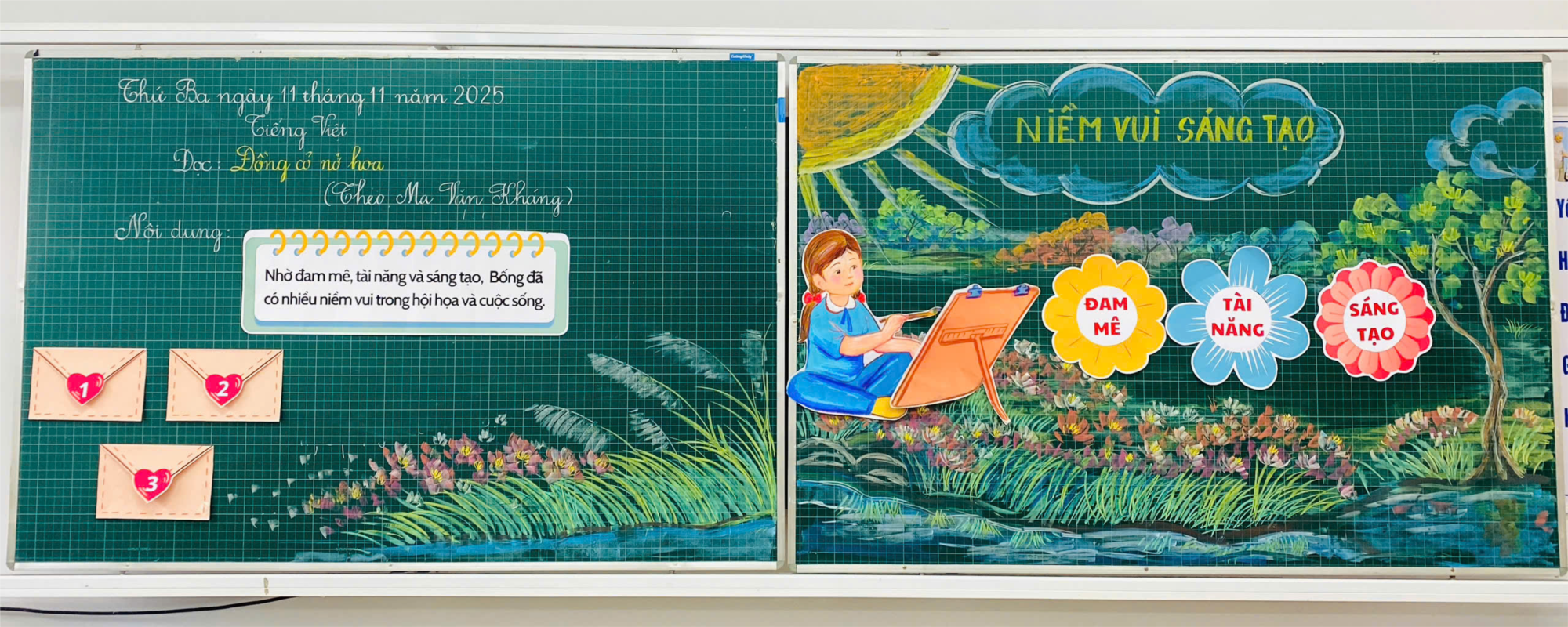 Trong suốt tiết học, học sinh được luyện đọc, được chủ động khám phá và cảm nhận nội dung bài đọc theo cách của riêng mình. Các con mạnh dạn chia sẻ suy nghĩ, bày tỏ quan điểm và cảm xúc trước cái đẹp của nghệ thuật. Đặc biệt, các con còn được bước vào một không gian trải nghiệm sáng tạo mở, nơi học tập gắn với đời sống và nghệ thuật, giúp mỗi ý tưởng đều có cơ hội nảy nở và tỏa sáng.