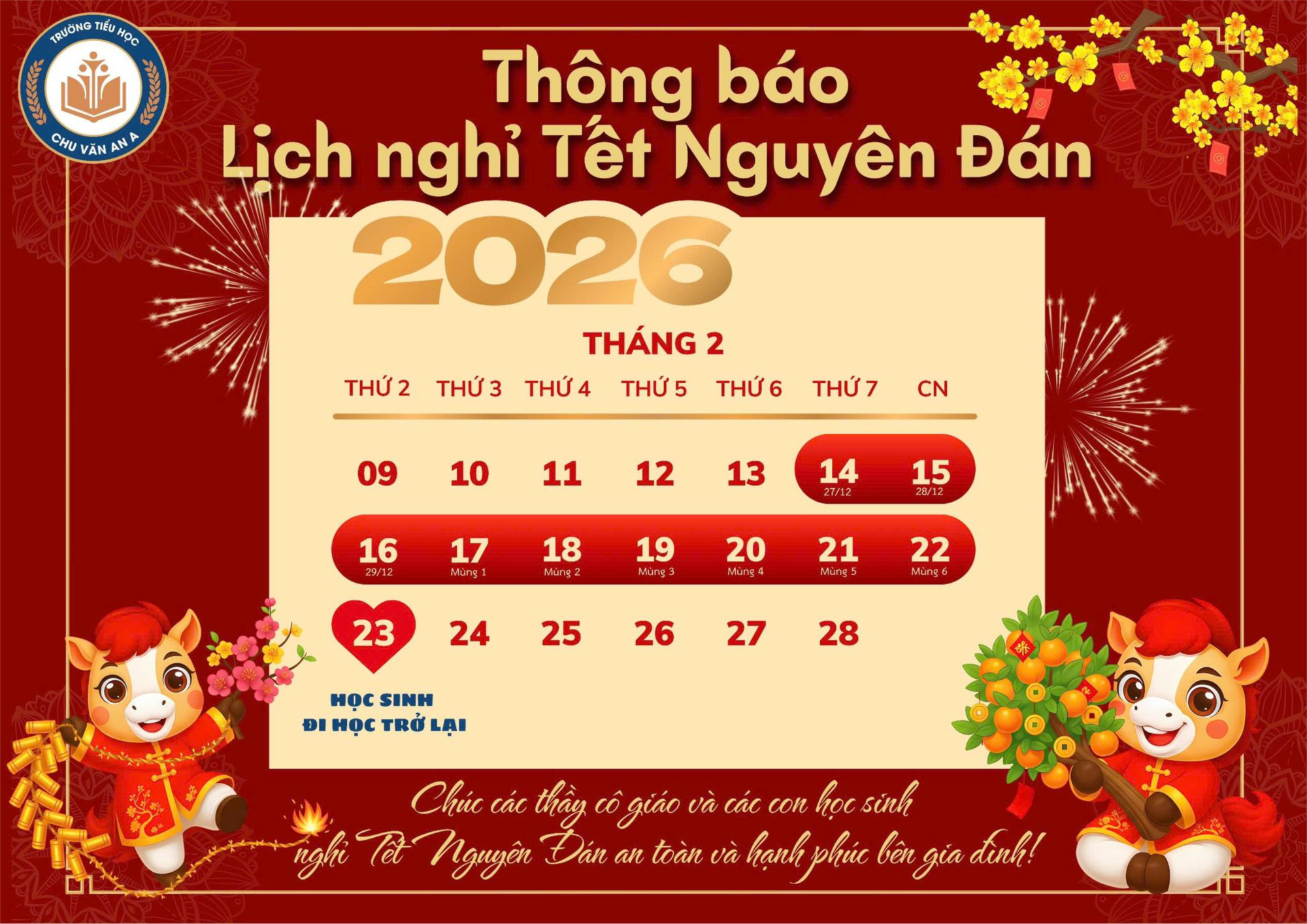 Nhà trường trân trọng thông báo lịch nghỉ Tết Nguyên Đán tới quý phụ huynh và các con học sinh.