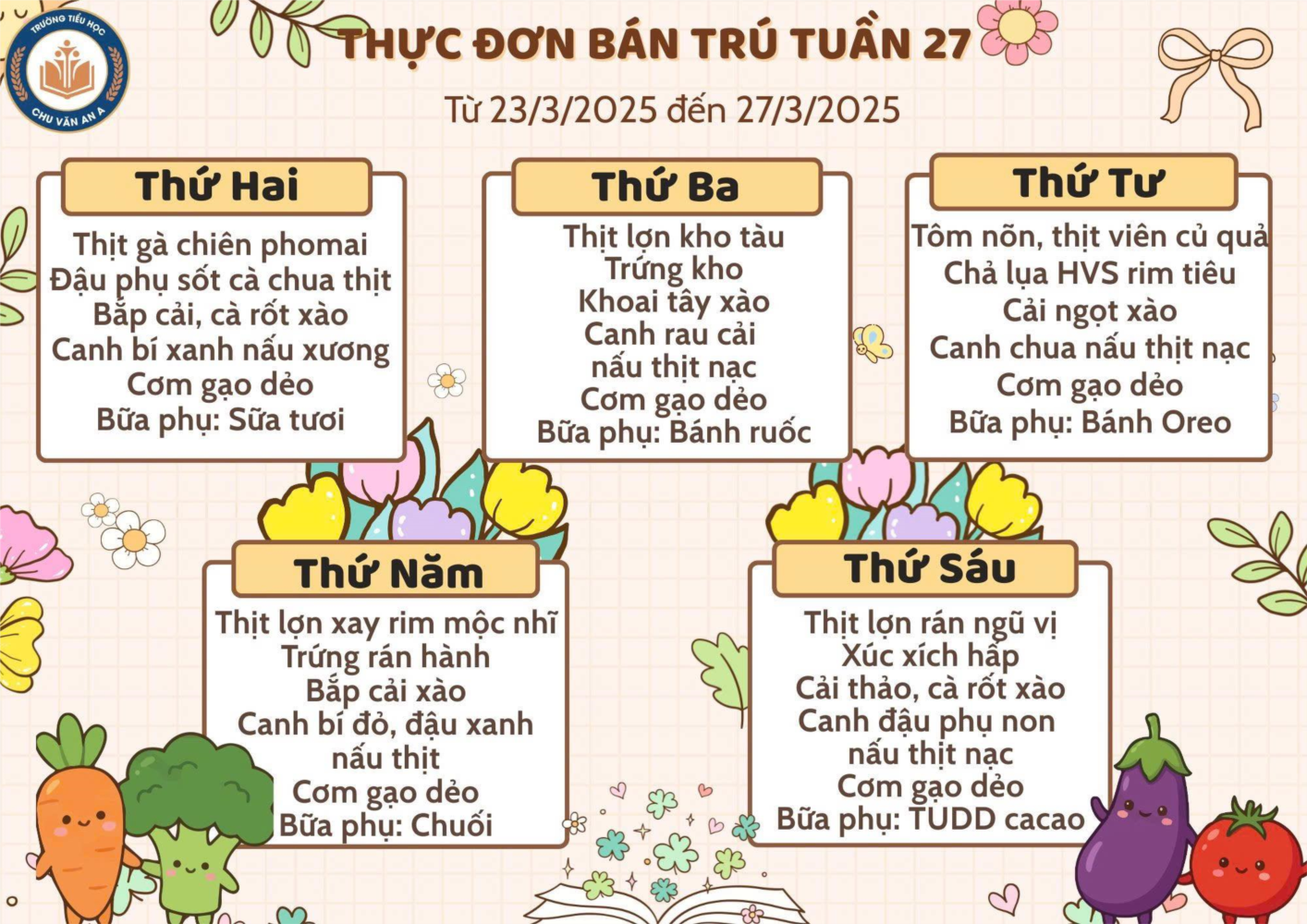 Tuần 27, bếp Chu A mang đến cho các con những bữa ăn đa dạng, đủ chất, hợp khẩu vị, kết hợp hài hòa giữa thịt, cá, rau xanh và món canh thanh mát.