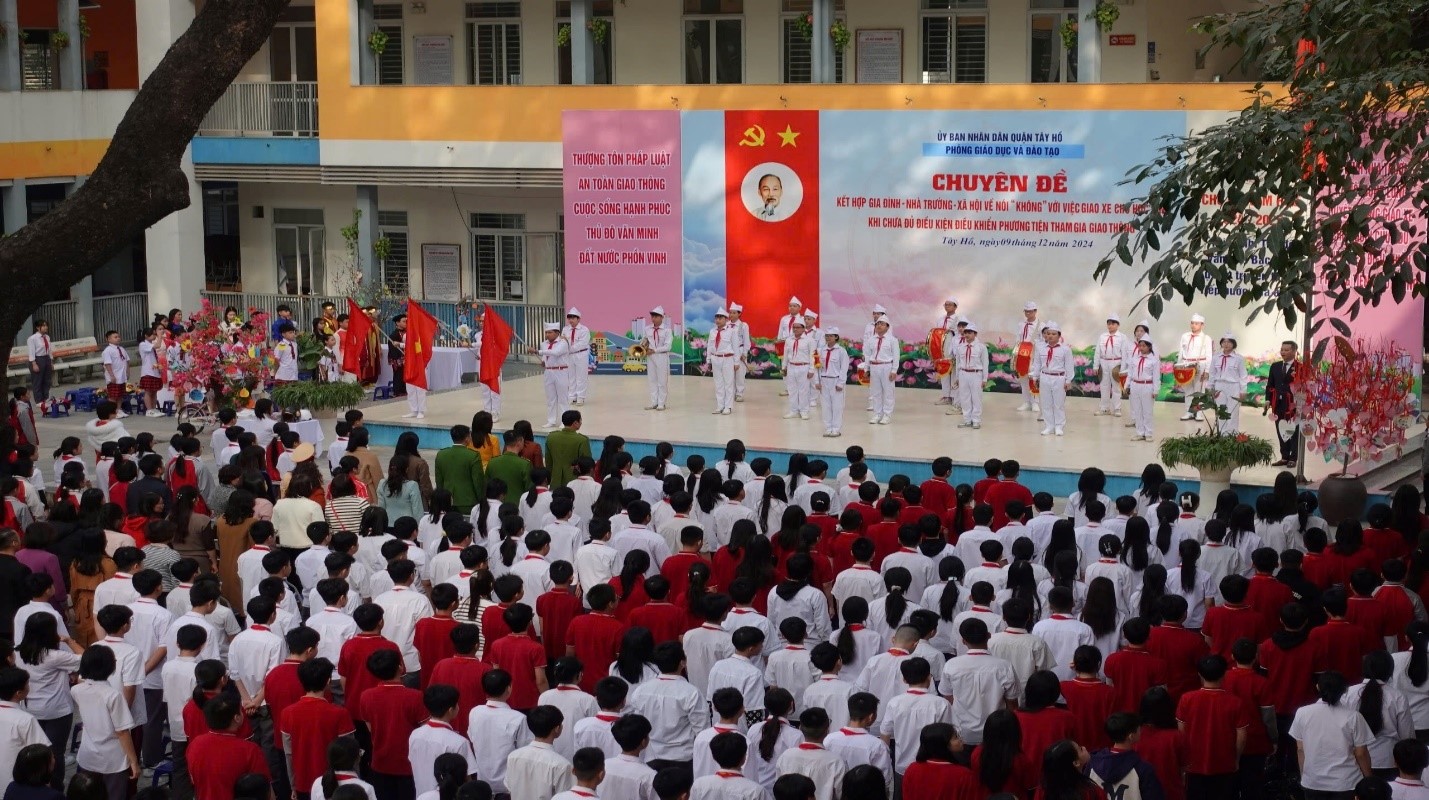 Thực hiện Kế hoạch số 53/KH-SGDĐT ngày 17/10/2024 của Sở Giáo dục và Đào tạo về việc tuyên truyền, giáo dục bảo đảm trật tự an toàn giao thông trong các đơn vị trường học ngành Giáo dục và Đào tạo năm 2024; Kế hoạch hành động số 356/KH-UBND ngày 19/11/2024 của UBND quận Tây Hồ về việc “ Thực hiện quy định của pháp luật về Không giao xe cho người không đủ điều kiện điều khiển phương tiện tham gia giao thông” trên địa bàn quận Tây Hồ năm 2024; Công văn số 435/PGDĐT ngày 05/12/2024 của phòng Giáo dục và Đào tạo quận Tây Hồ về việc triển khai Kế hoạch hành động thực hiện quy định của pháp luật về “Không giao xe cho người không đủ điều kiện điều khiển phương tiện tham gia giao thông” trong các đơn vị trường học trên địa bàn quận Tây Hồ năm 2024; hôm nay, ngày 9/12/2024, trường THCS Phú Thượng kết hợp với Công an quận Tây Hồ tổ chức Chuyên đề “Kết hợp Gia đình – Nhà trường – Xã hội” về nói “KHÔNG” với việc giao xe cho học sinh khi chưa đủ điều kiện điều khiển khi tham gia giao thông.