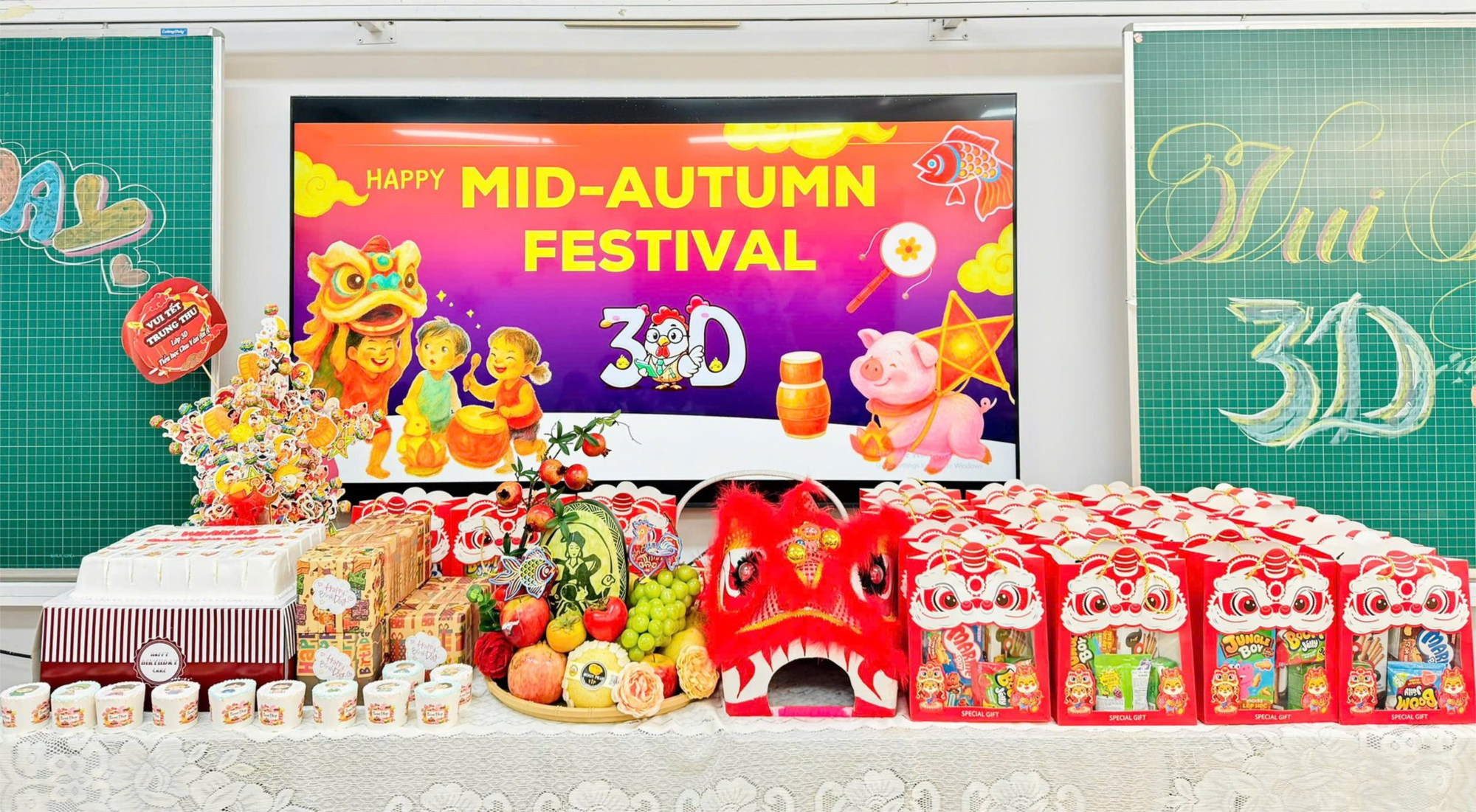 Ánh mắt trẻ thơ trong veo ánh lên niềm háo hức khi ngắm nhìn những mâm cỗ Trung thu rực rỡ sắc màu. Từ đôi tay khéo léo của thầy cô, cha mẹ và học trò, quả bưởi xanh hóa thành chú chó ngộ nghĩnh, chùm nho, quả cam thành thỏ, cá, chim… Bánh nướng, bánh dẻo được sắp đặt tinh tế bên cạnh hoa quả tạo nên mâm cỗ đẹp mắt. Mỗi lớp mang đến một sắc màu riêng nhưng cùng chung gửi gắm niềm mong ước đoàn viên và ký ức tuổi thơ trong sáng. Và trong niềm hân hoan ấy, tiếng cười trong veo của học trò chính là dư âm đẹp nhất của mùa trăng....