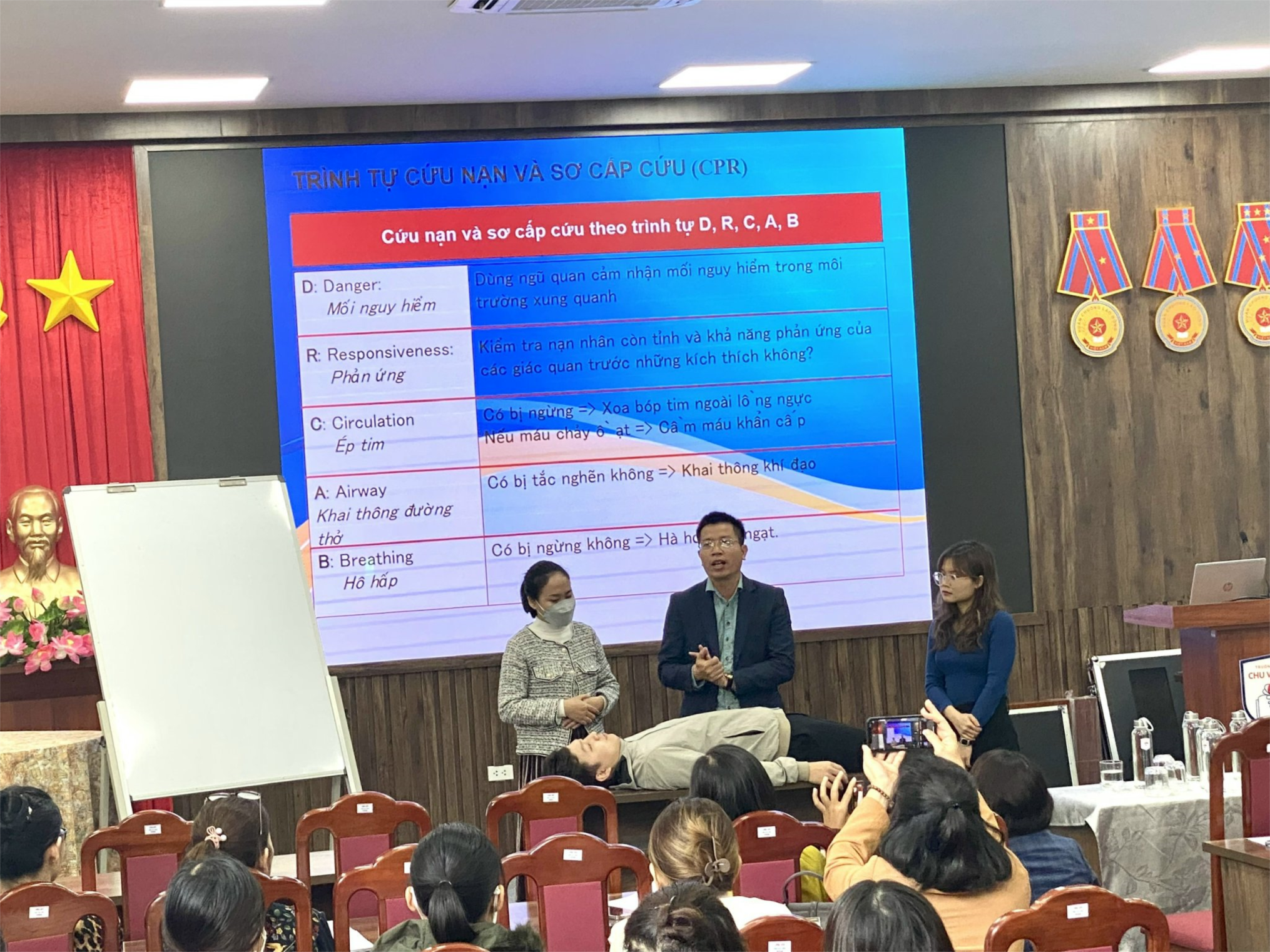 Tại buổi tập huấn, giảng viên Ths. Nguyễn Danh Khoa - Cán bộ Viện Khoa học an toàn Việt Nam đã cung cấp cho cán bộ, giáo viên trong trường những kiến thức khoa học về sơ cấp cứu ban đầu đúng cách trong giai đoạn vàng là ba phút đầu xảy ra tai nạn như đuối nước, giật điện, hóc dị vật … khoảng 80% nạn nhân sẽ qua khỏi. Đây là những kĩ năng rất cần thiết đã được giảng viên chú trọng, giảng rất kĩ với mong muốn phòng tránh tai nạn thương tích cho học sinh để con em chúng ta lớn lên trong một ngôi trường an toàn.