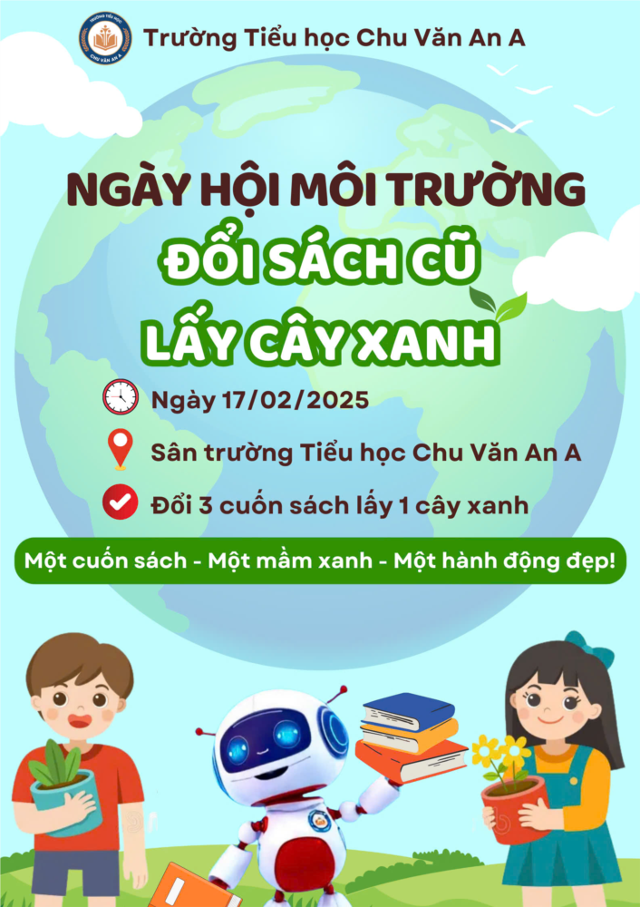 Để hưởng ứng phong trào thi đua "Sáng -Xanh - Sạch - Đẹp" của ngành GD&ĐT, trường Tiểu học Chu Văn An A, vào ngày thứ Hai (17/2/2025) sẽ tổ chức Ngày hội môi trường đổi sách cũ lấy cây xanh với mục tiêu: giáo dục HS yêu môi trường, trồng cây xanh và xây dựng thêm sách truyện cho thư viện mở. Một hành động nhỏ nhưng ý nghĩa lớn: vừa giúp sách có thêm người đọc mới, vừa góp phần phủ xanh không gian sống