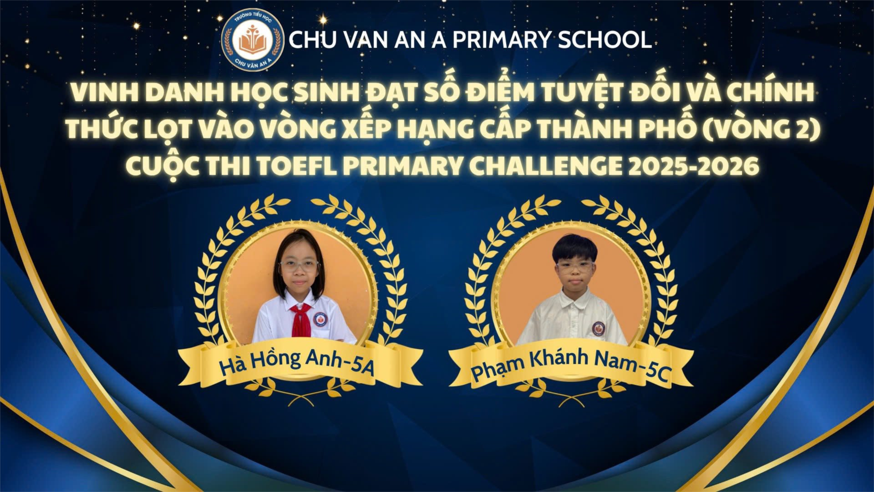 Trường Tiểu học Chu Văn An A vô cùng tự hào khi nhận được thông báo chính thức từ Ban Tổ chức cuộc thi TOEFL Primary Challenge 2025-2026 về kết quả Vòng Tuyển chọn cấp Thành phố (Vòng 1).